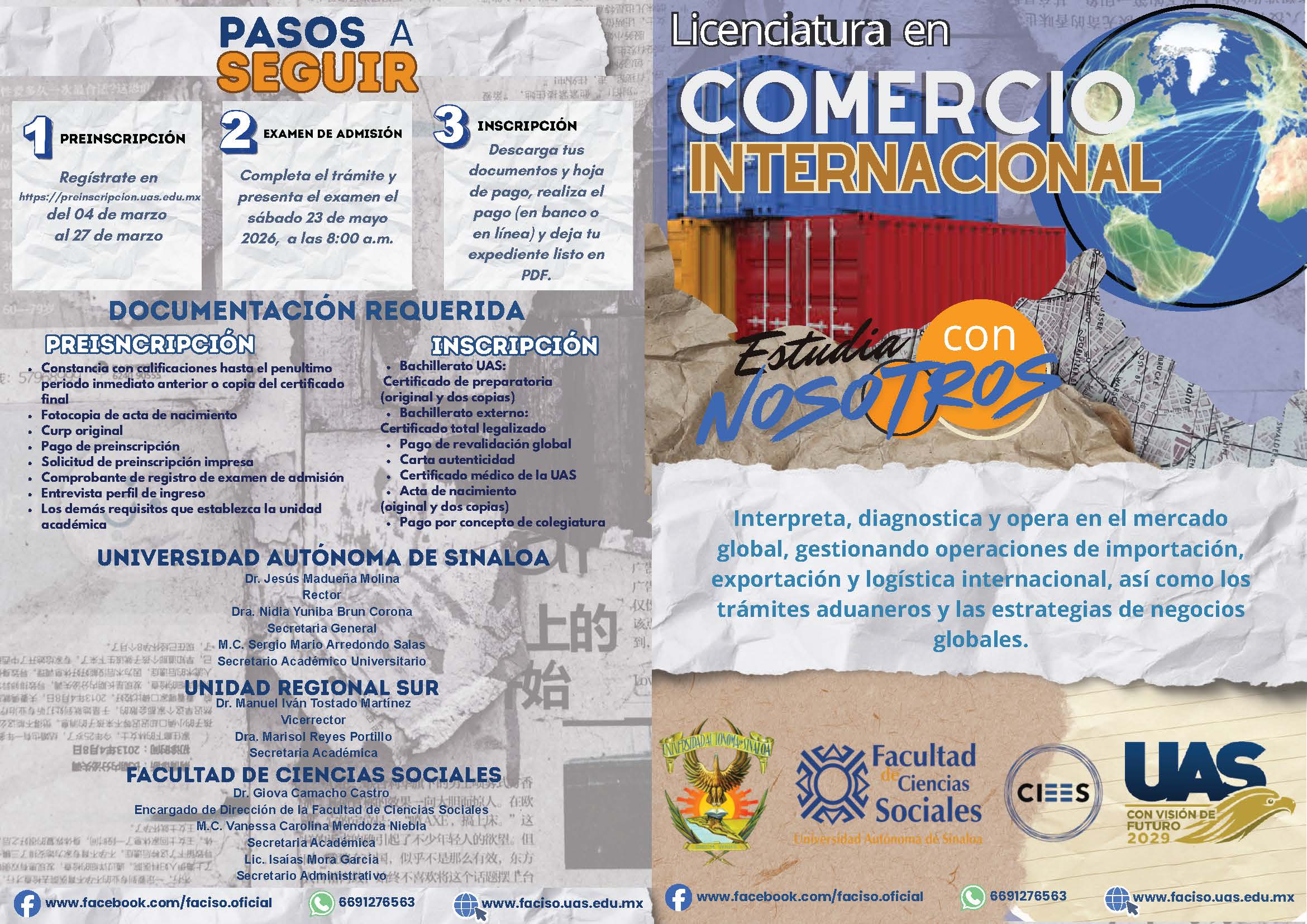 El objetivo de la Licenciatura en Comercio Internacional es formar profesionistas capacitados para participar en la creación y operación de empresas exportadoras e importadoras de bienes y servicios en la región, el estado y el país; así como asesorar a las empresas en los aspectos relacionados con las prácticas del comercio internacional. Además, desarrollar habilidades en la gestión de proyectos de inversión, análisis financiero y conocimiento del sistema financiero internacional. Adicionalmente, fomentar un pensamiento crítico y reflexivo sobre aspectos actuales del mercado global con el fin de tomar decisiones adecuadas ante las diversas vicisitudes.